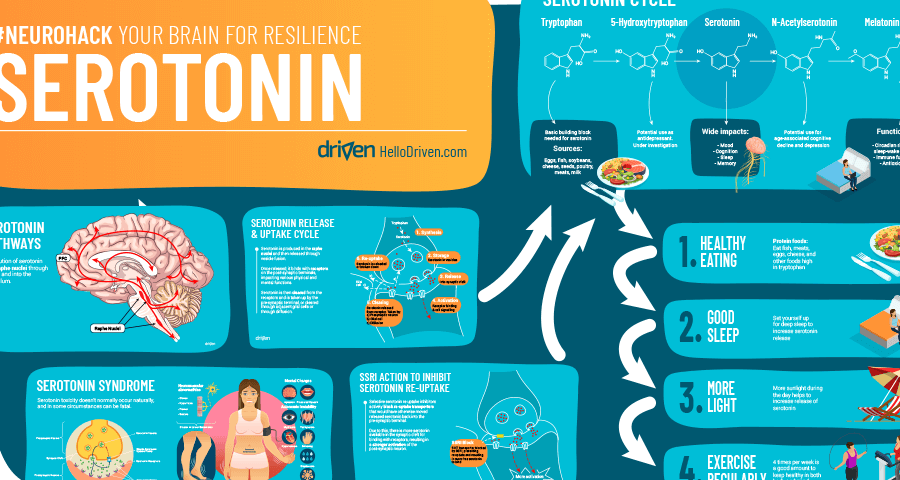 La serotonina, o 5-hidroxitriptamina (5-HT), es una molécula compleja creada a partir del aminoácido triptófano, que se encuentra en una variedad de alimentos como: